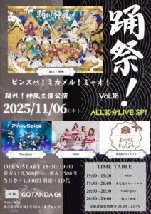 スケジュール トップスケジュール 五反田G6 2025.11.06.thu 五反田G6 踊れ!神風主催踊祭!『踊れ!ピンスパ!ミカメル!ミャオ!』vol.18 🗓11/6(木) 📍五反田G6 ⏱OPEN 18:30/START 19:30 🎤ライブ 19:00-19:30 📸特典会 21:05-22:15 🉐指名入特 写メトークor30秒動画 チケットはこちらから🔗 t.livepocket.jp/e/odokami1106 ※チケ発 10/12(日) 23:00 📸静止画の撮影可能👌🏻 ⚠️特典会中は感染対策のため、マスクの着用にご協力いただきますようお願い申し上げます😷