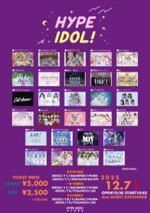 スケジュール トップスケジュール 渋谷duo 2025.12.07.sun 渋谷duo 『HYPE IDOL!』 🗓12/7(日) 📍duo MUSIC EXCHANGE ⏱OPEN 10:30/START 10:45 🎟前方 ¥5,000/ 一般 ¥2,500 (各+1D) チケットはこちらから🔗 t-dv.com/hype_1207 ※先行抽選11/30 (日) 23:59まで 📸静止画の撮影可能👌🏻 ⚠️特典会中は感染対策のため、マスクの着用にご協力いただきますようお願い申し上げます😷