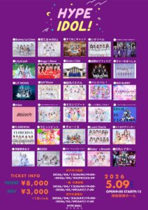 スケジュール トップスケジュール 神田明神ホール 2026.05.09.sat 神田明神ホール 『HYPE IDOL!』 🗓5/9(土) 📍神田明神ホール ⏱OPEN 9:00/START 9:15 🎟前方 ¥8,000/ 一般 ¥3,000 (各+1D) チケットはこちらから🔗 t-dv.com/hype0509 ※先行抽選4/24(金) 23:59まで 📸静止画の撮影可能👌🏻 ⚠️特典会中は感染対策のため、マスクの着用にご協力いただきますようお願い申し上げます😷