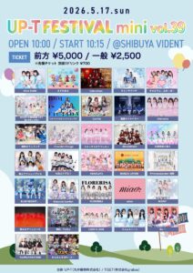 スケジュール トップスケジュール VIDENT 2026.05.17.sun VIDENT 『UP-T FESTIVAL mini Vol.39』 🗓5/17(日) 📍 SHIBUYA VIDENT 開場:10:00 開演:10:15 🎟前方5000円 / 一般2500円 / 当日各+1000 (入場時1ドリンク必須) チケットはこちらから🔗 tiget.net/events/481236 ※チケ発4/17(金) 19:00 📸静止画の撮影可能👌🏻 ⚠️特典会中は感染対策のため、マスクの着用にご協力いただきますようお願い申し上げます😷